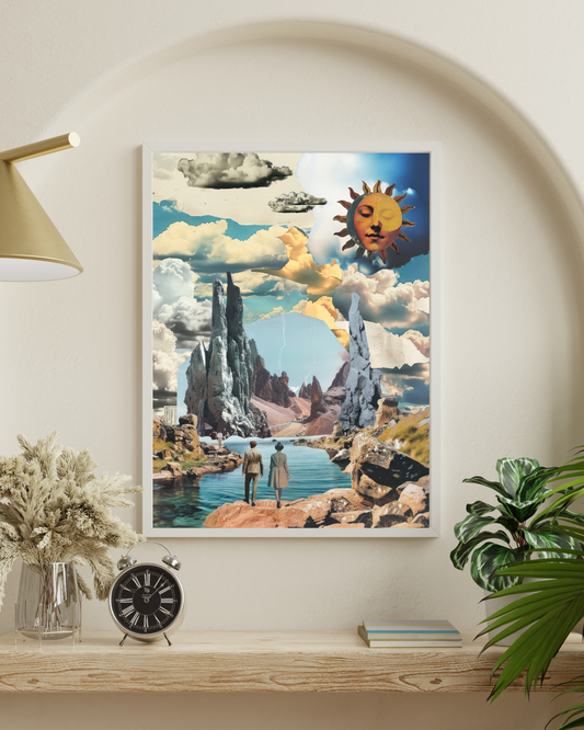 Wall Art Print - Surreal Portal Collage | Dreamscape with Vintage Figures, Cosmic Sun & Fantasy Mountainscape