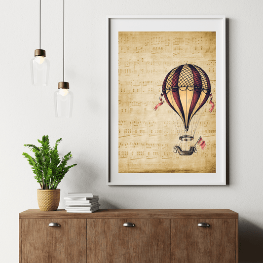 Wall Art Print - Hot Air Balloon | Antique Travel Illustration on Aged Sheet Music Background