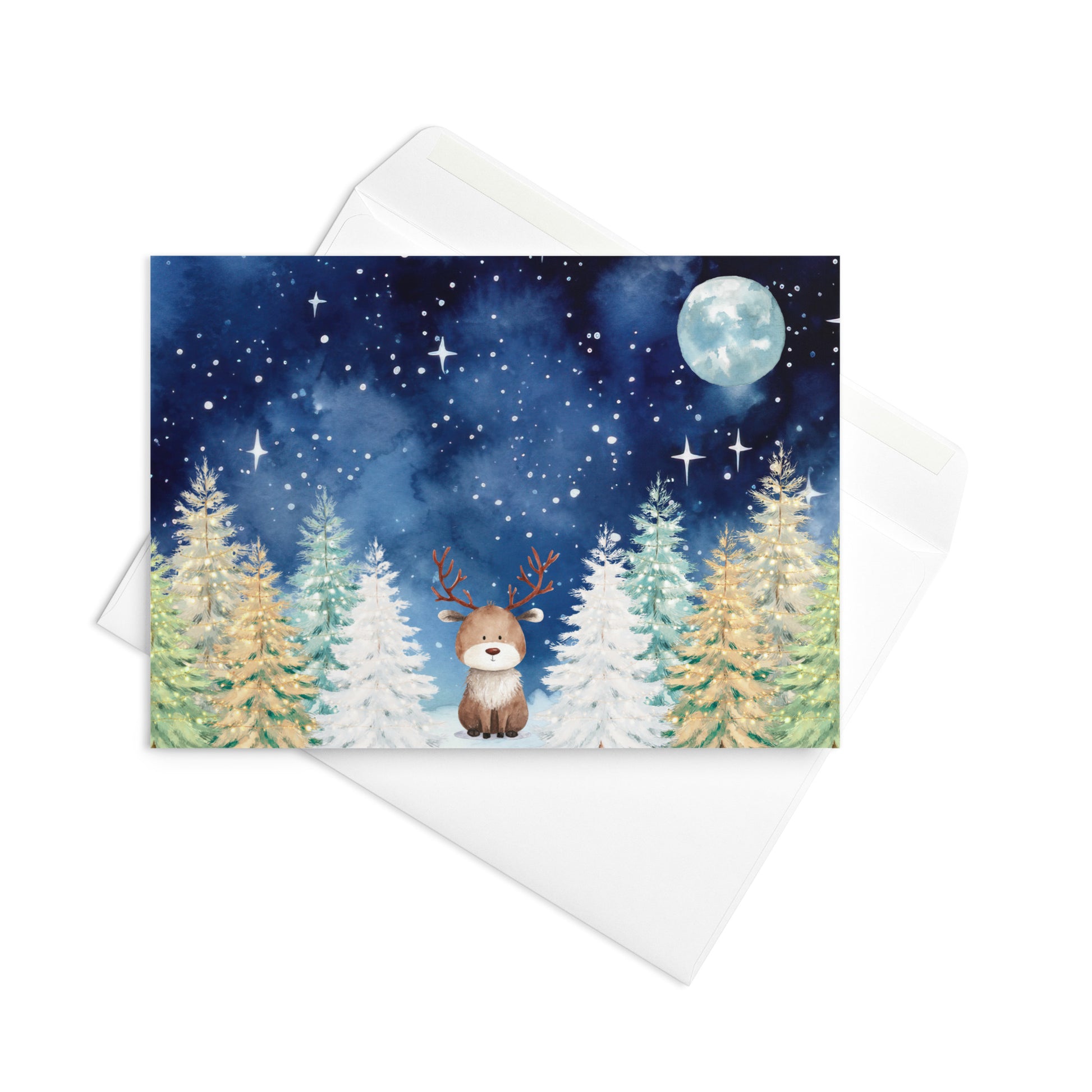 A sweet Christmas card featuring a cute watercolour reindeer sitting in a glowing winter forest beneath a star-filled night sky. The twinkling lights on the trees and the soft moonlit background give this design a magical festive feel. Perfect for those who love cute Christmas artwork, winter woodland themes and charming holiday scenes. A lovely choice for festive gifting, stocking fillers and seasonal card sets.
